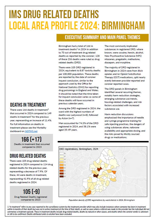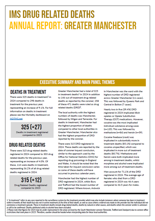 This interim report details Drug Related Deaths (DRD) and mortality in-treatment across Greater Manchester for the year 2022 reported through the IMS DRD surveillance system which is now operational in all ten local authorities across the region.
